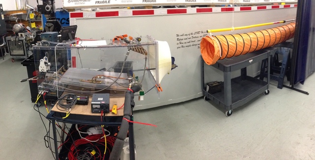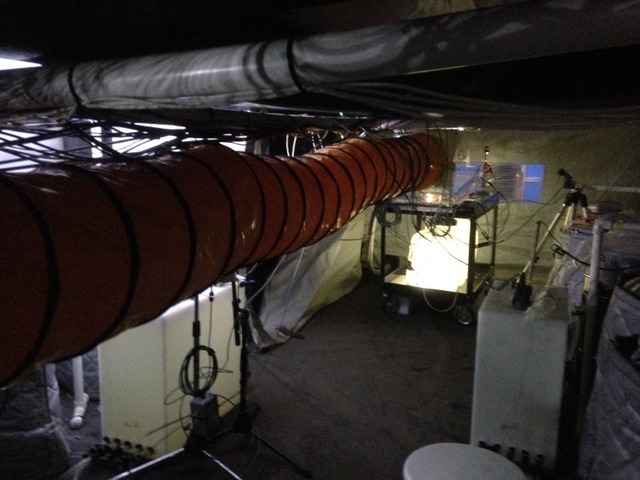 Once it passed all our lab testing, it was sent to NIOSH for testing inside an actual mine. Here's a picture of the setup during the 96 hour test. The glowing white tank under the air plenum collects the condensate from the heat exchanger, very similar to a home air conditioning system. LED lighting was added so the waterline was visible. |