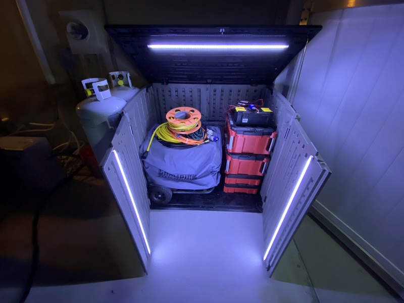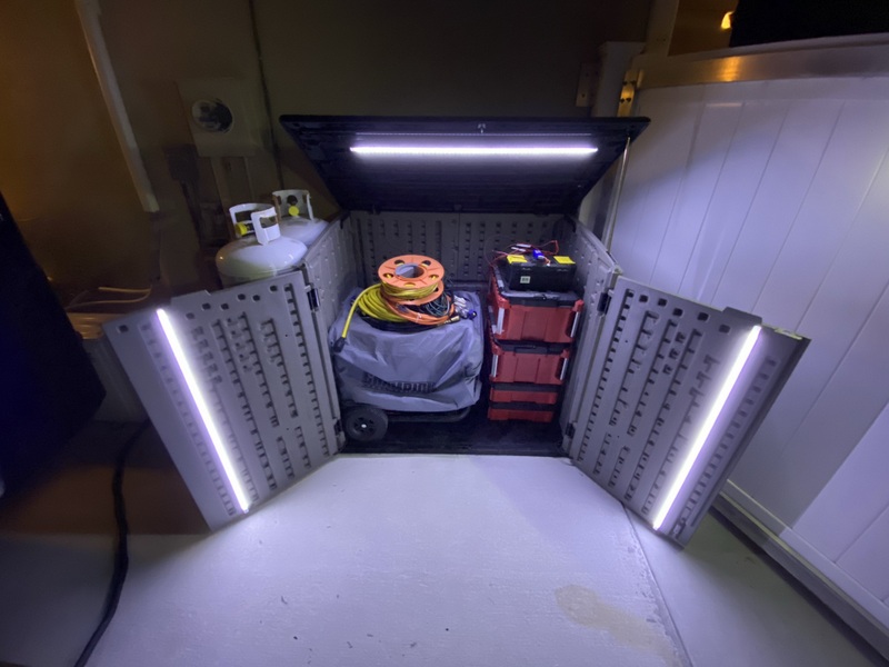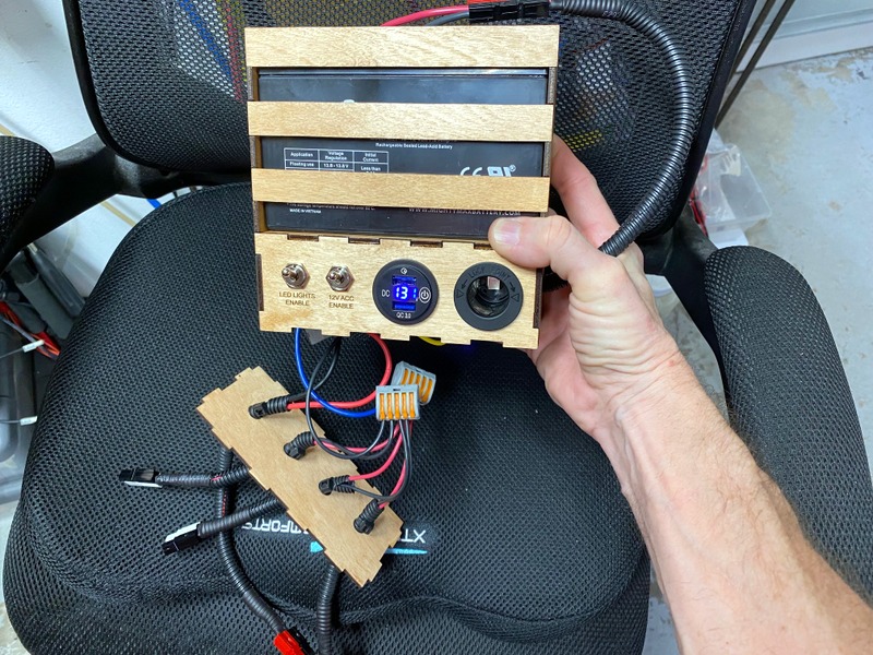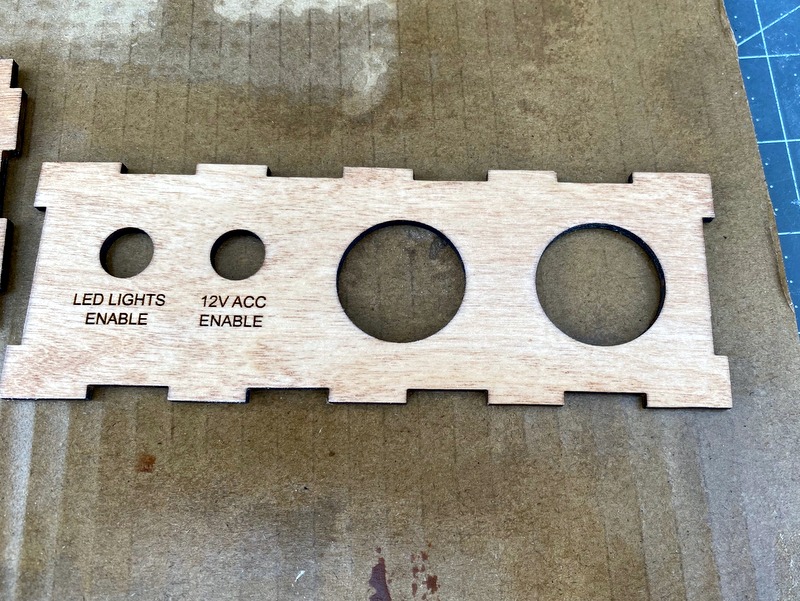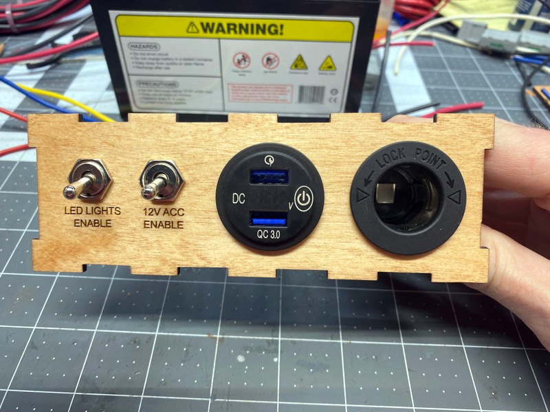 I could have simply wired the battery to the LEDs and the switch, but I have a bunch of spare components from other projects laying around. I wanted the ability to turn off the lights during the day, or during extended outages. I also wanted the ability to recharge cell phones, or run other 12V appliances. I added a second switch to turn those off when not needed to avoid any parasitic loads. The SVG files are located at the bottom of this page if you have access to a laser cutter, or 3D printer. I made these from 3mm thick Baltic Birch plywood. The wood was stained, clear coated, and assembled with epoxy. The bottom plate is screwed in place in case I need access in the future. The text under the switches is laser engraved. Details on the storage box are here. |