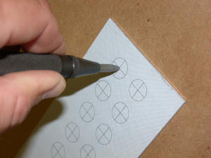 After the adhesive set, an automatic center punch was used to mark the panel. This prevented the drill bit from wandering, and the marks would stay, even if the paper pattern was damaged. |