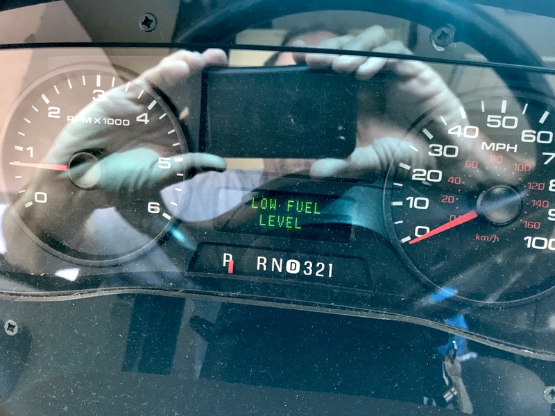true? On the way back from a recent trip, we were on a deserted section of road, with no gas stations for miles. When we finally found one, the line was around the corner, and I'm not sure we would have fit with the Jeep still connected. Though my fuel gauge was getting low, I wasn't immediately concerned as my generator was still chugging along. I had at least a 1/4 tank of fuel, right? The RV was still fairly new to us, and I've never checked the accuracy of the gauge, nor ever run the fuel this low. I continued on, knowing if I did run it dry, the Jeep would double as a lifeboat, and I could go fetch fuel in it. It seemed like another hour went by before finally finding civilization, and plenty of gas stations. I pulled in, took pictures of the dash display, and recorded the actual fuel it took to fill up. |