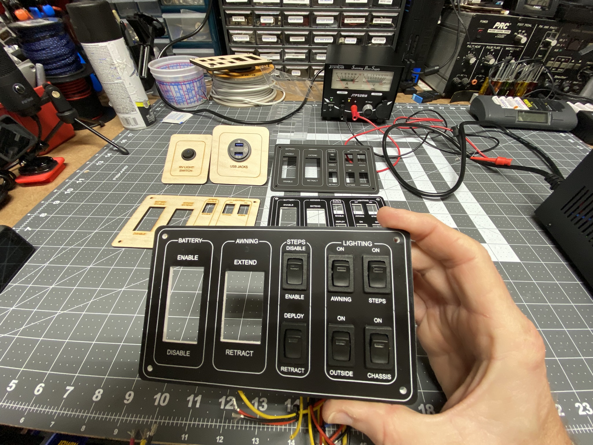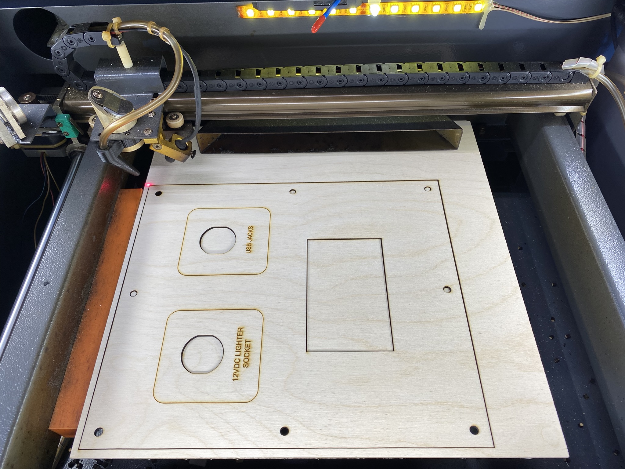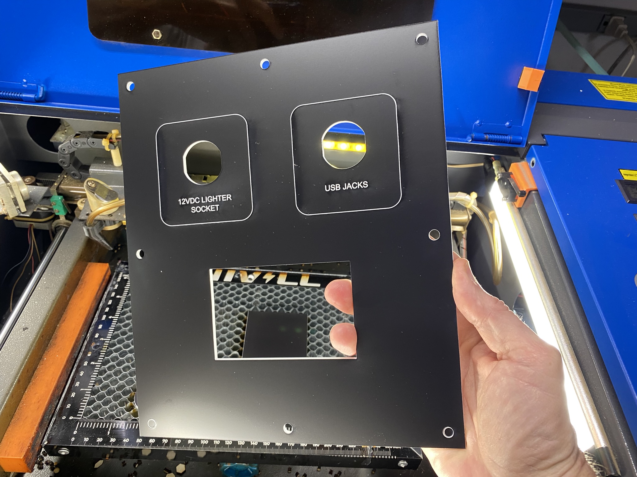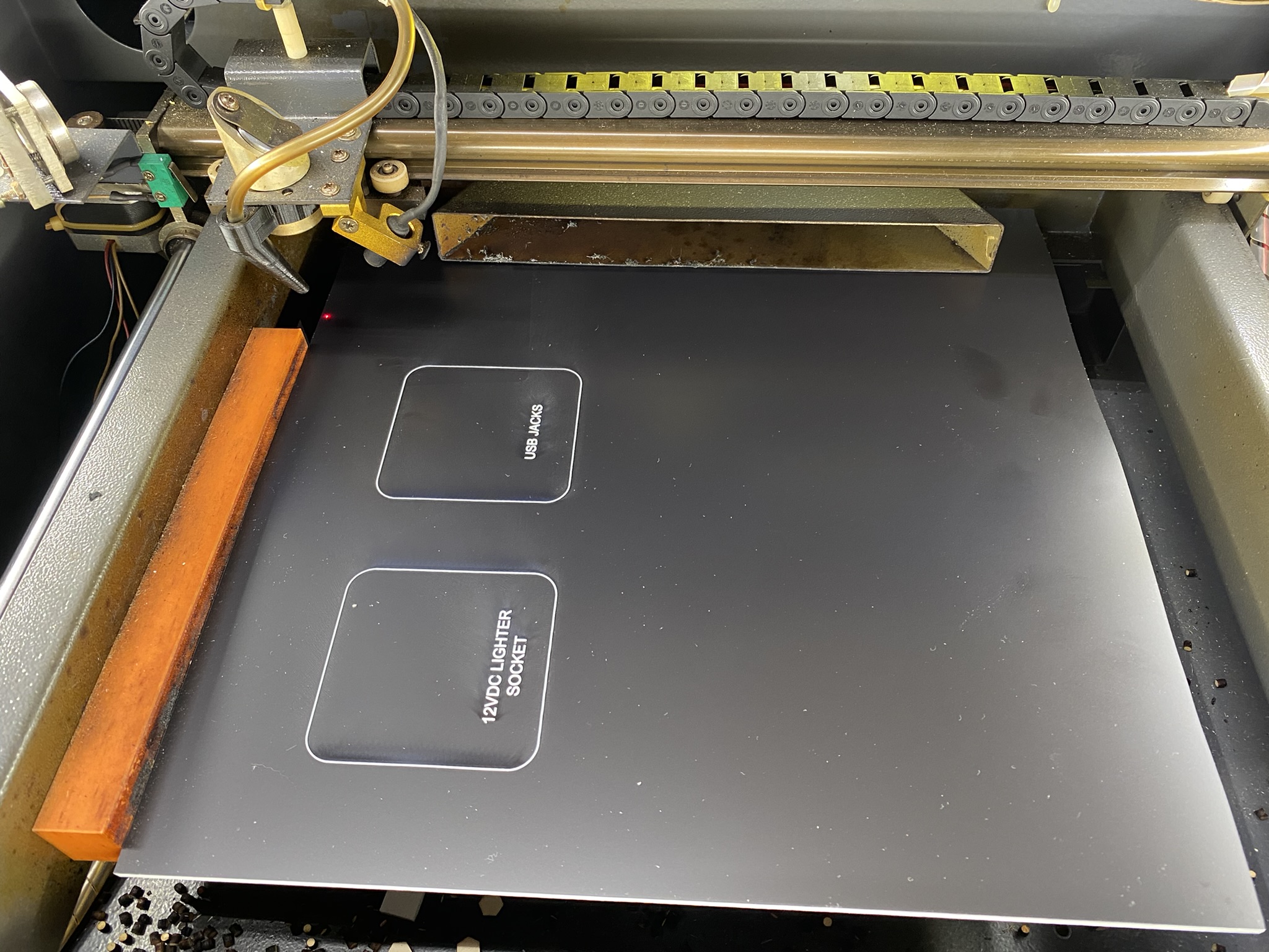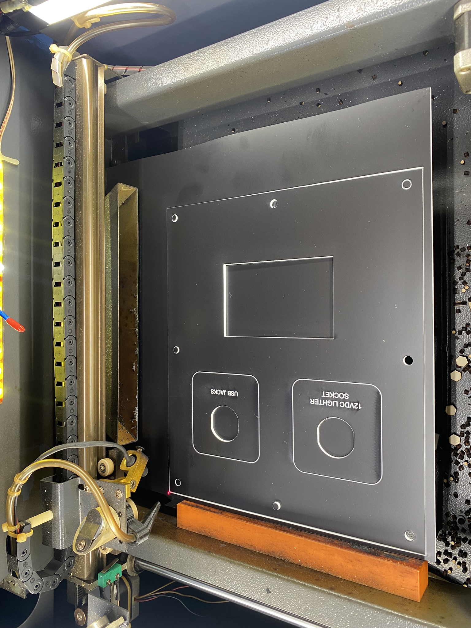 Now that the prototype panel fits as expected, time to engrave the acrylic laminate. This is a really nice material, intended for laser engraving and cutting. Make sure to turn off the air assist. By doing so, the engraved letters are cleanly done. Leaving the air assist on leaves groves in the valleys of the letters. |