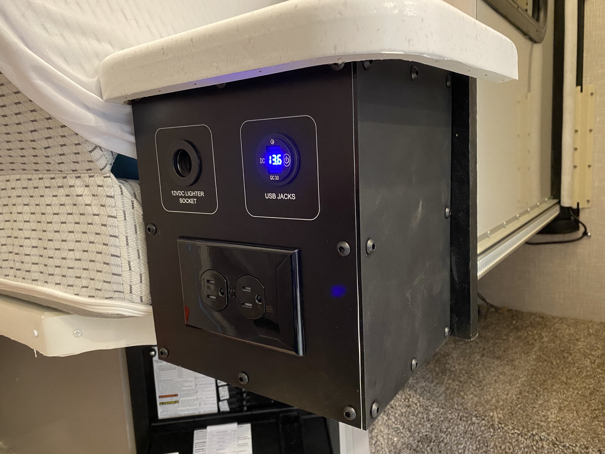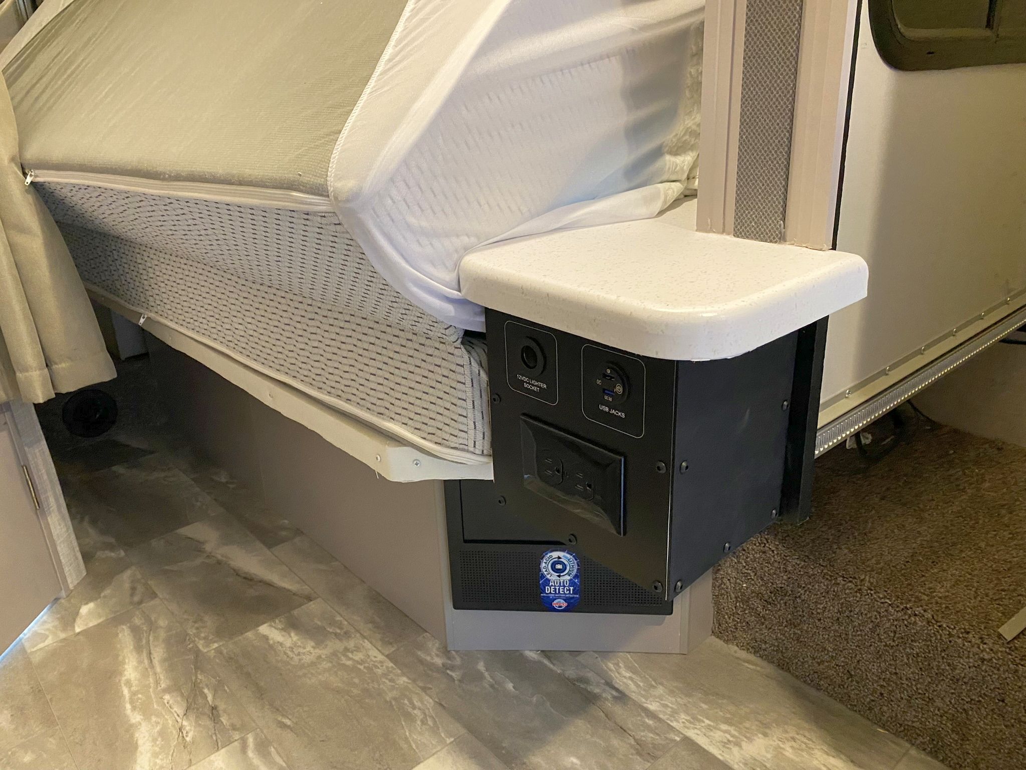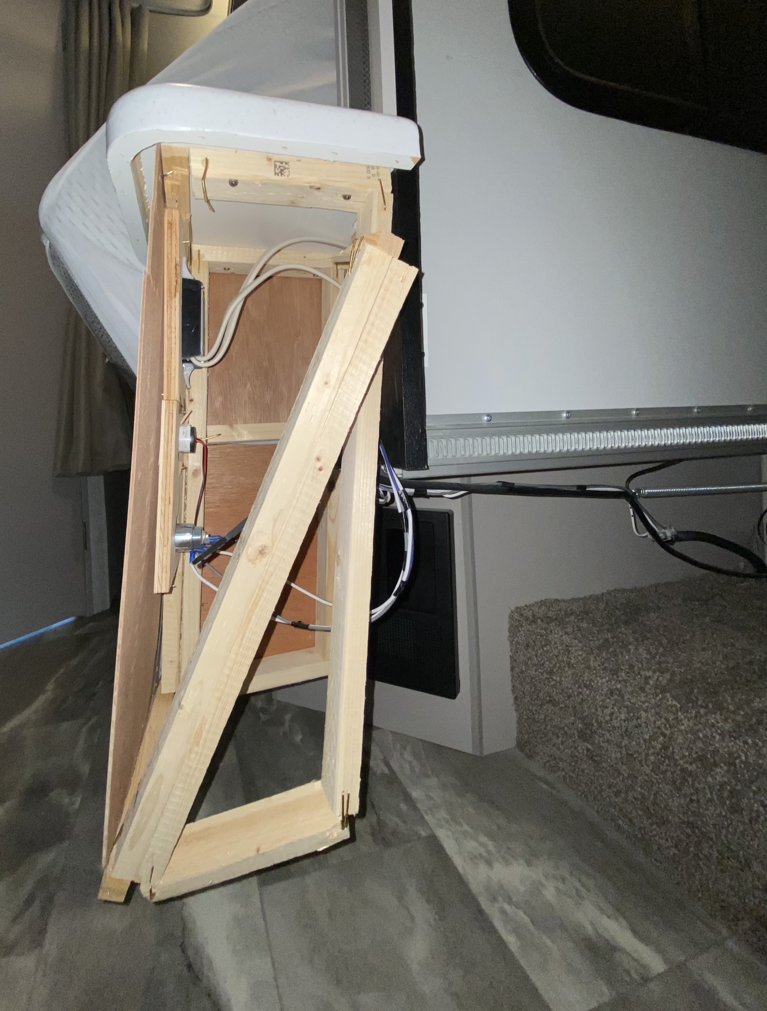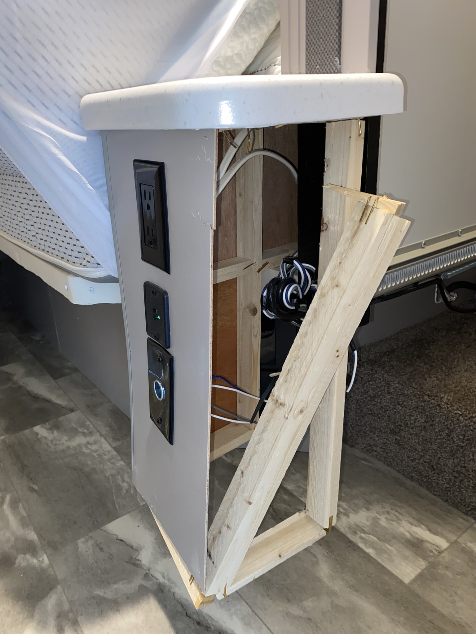 The nightstand on the right is attached to the shelf above, and floats a few inches above the floor. It moves as the slide is extended, or retracted. |
