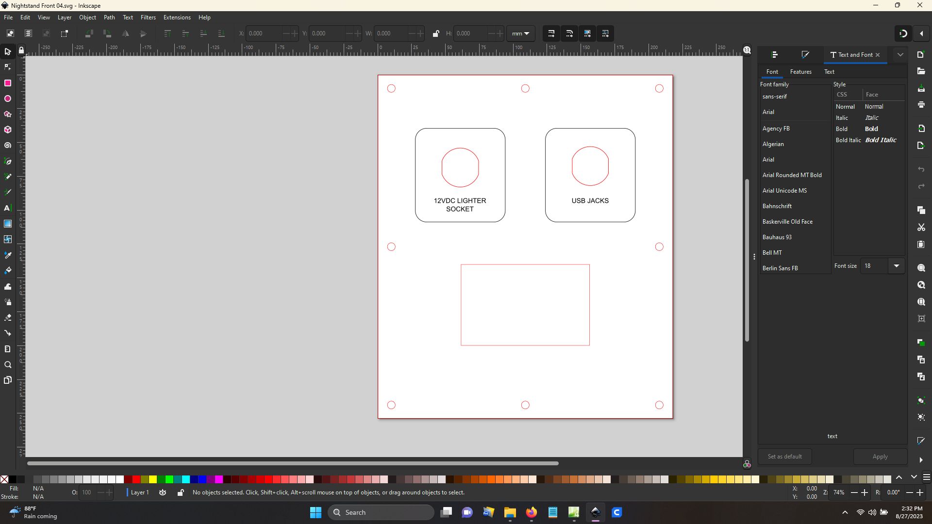 ![]() Inkscape is freeware. Excellent program, but I did need to watch a few YouTube videos to use some of the tools. The layout is very simple. The circles around the perimeter are sized for mounting hardware, and spaced to fit the 2020 extruded aluminum pieces. Here's the file for the front panel - link. Here's the file for the side panel. |